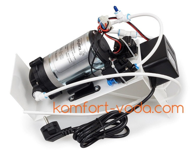 Комплект підвищення тиску KP-P6005-S для систем зворотного осмосу, в зборі з блоком живлення, датчиками низького і високого тиску, фітингами і шлангами, на монтажній пластині.